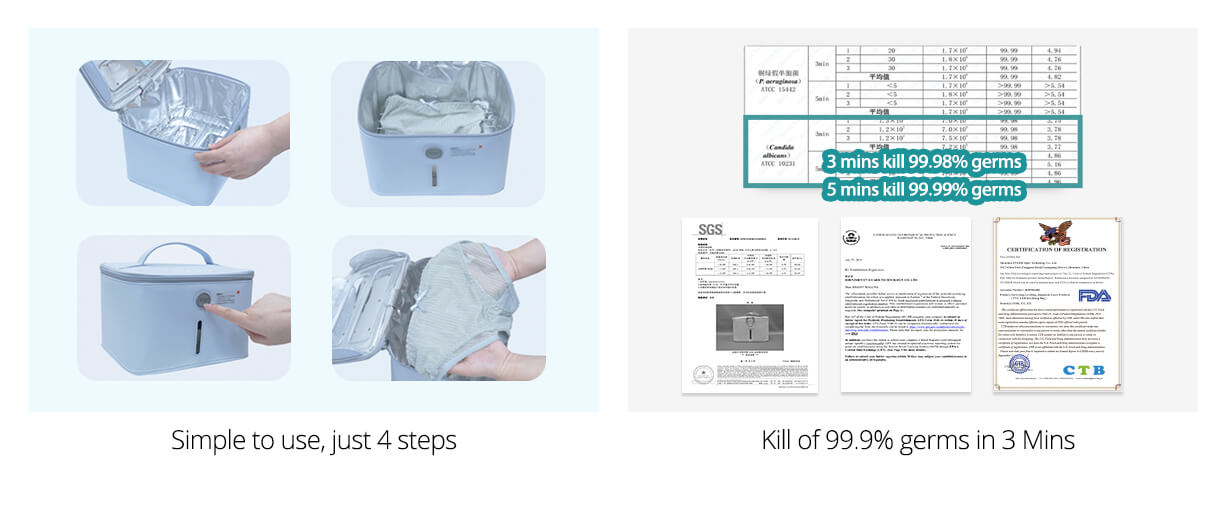 - 4. PROTECTION & SAFETY DESIGN - Zip up the bag, click the button, and clearly see the purple light trough the transparent area in cleaning mode, no light leak out.